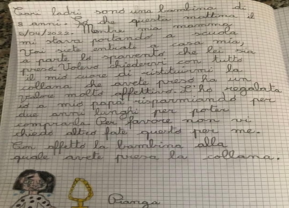 "Cari ladri, restituite la collana al mio papà": la tenerissima lettera