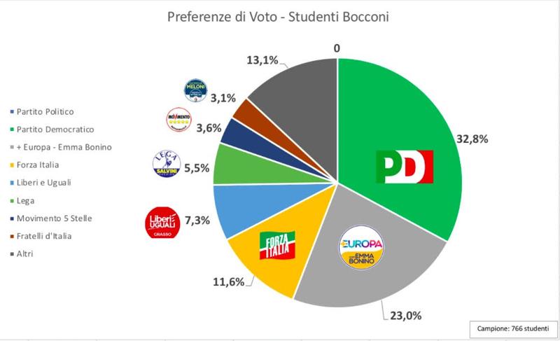 In un campione di 766 studenti elaborato dalla rivista universitaria “Tra i Leoni” dell’Università Bocconi di Milano è emerso che la maggioranza degli studenti del prestigioso ateneo milanese voteranno alle prossime elezioni il PD di Renzi con una percentuale che si aggira intorno al 33%.