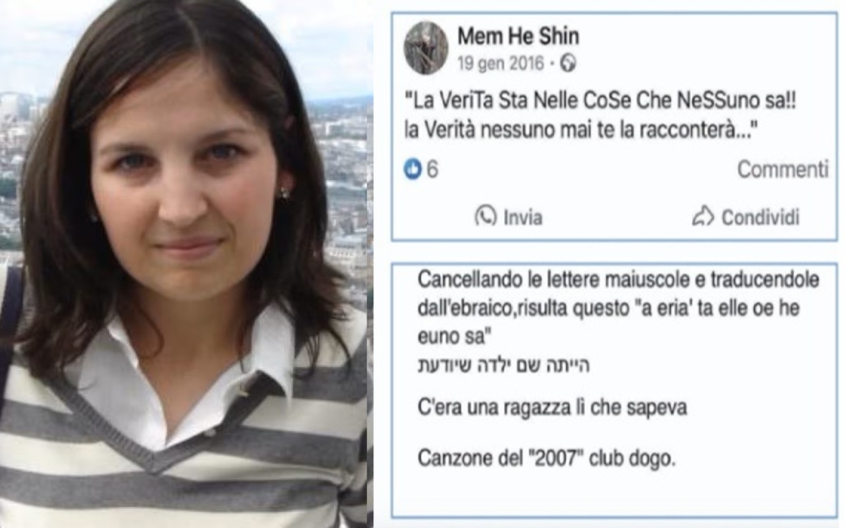 “La VeriTà Sta Nelle CoSe Che NeSSuno sa!!! la Verità nessuno mai te la racconterà”. Anche la cabala per interpretare l’enigmatica frase postata su Facebook poco prima di togliersi la vita da Michele Bertani. L’amico di Andrea Sempio, scomparso nel 2016, aveva lasciato questa frase, una citazione di una canzone del Club Dogo, sulla propria bacheca. Parole già di per se allusive. Ma che nasconderebbero un ulteriore messaggio. L’occhio cade infatti sulla inusuale scelta di utilizzare maiuscole e minuscole per comporre la prima frase. Bene, secondo il settimanale Gente, eliminando le lettere maiuscole, le lettere minuscole rimaste, “a eria’ ta elle oe he euno sa”, trasmutate nell’alfabeto ebraico, formano una frase che tradotta in italiano reciterebbe: “C’era una ragazza lì che sapeva”.