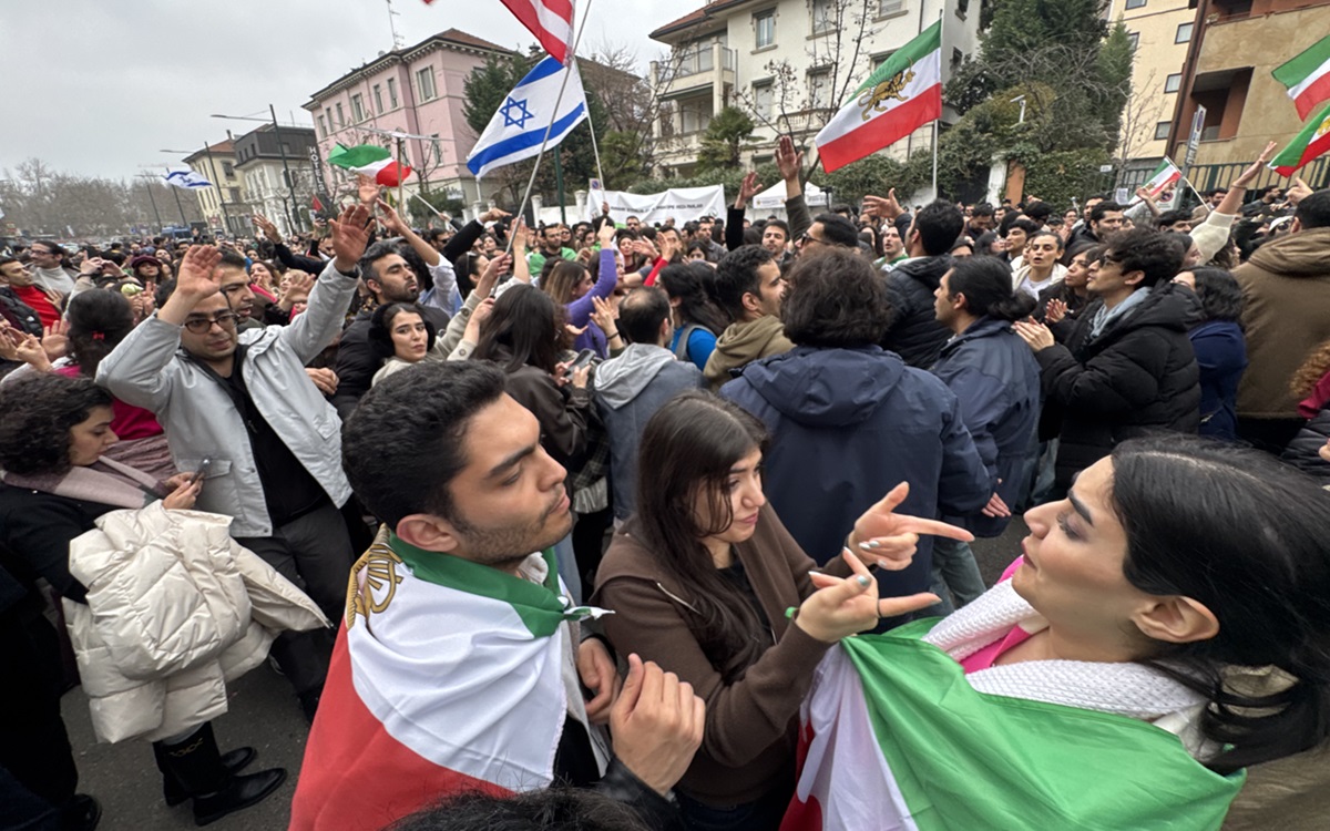 Intorno alle 14.30 circa un migliaio di persone, tra iraniani e italiani, si sono radunate davanti alla sede diplomatica. In mano le vecchie bandiere iraniane con il simbolo dello Shah di Persia, simbolo dell’Iran pre-rivoluzione islamica, e in alcuni casi anche bandiere israeliane.