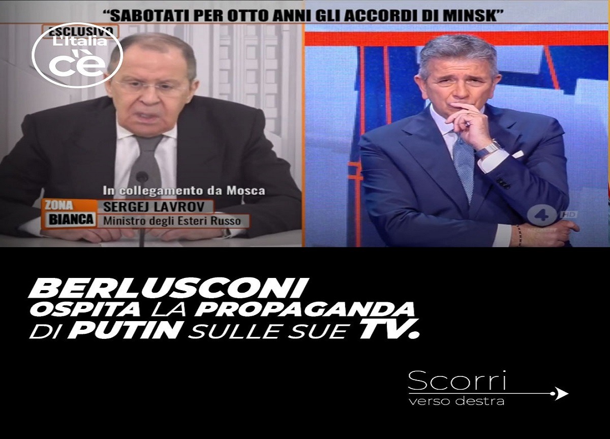 Nel primo post della campagna - che proseguirà nei prossimi giorni - sono messe in evidenza alcune posizioni controverse dell’attuale coalizione di centrodestra: la Meloni che blandisce i no vax, che non vuole la svolta ecologica e che auspica una scuola senza bocciature (“tipo 6 politico dei sessantottini”, dice il promotore de L’Italia C’è Emanuele Pinelli, che nella vita fa l’insegnante scolastico); Salvini amico di Orban, euroscettico e contrario agli investimenti al Sud; e, infine, Berlusconi che ospita sulle sua Rete4 la disinformazione del ministro degli Esteri di Putin, Sergej Lavrov.