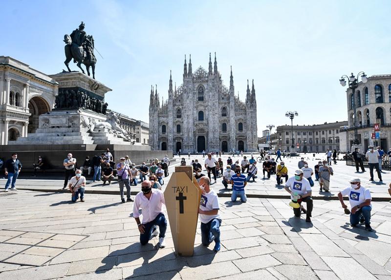 Per testimoniare la "morte" del loro lavoro i tassisti milanesi hanno portato al presidio nel parcheggio di piazza Duomo una rudimentale bara, realizzata con cartone e cassette di legno. Chiedono sostegno economico, in particolare alla Regione Lombardia, in quanto la categoria e' "in ginocchio" dopo settimane di diffusione di coronavirus. E proprio per rimarcare questo concetto, i tassisti si sono fatti immortalare posando in ginocchio, con un gesto che è parso rievocare quello che altrove nel mondo in questi giorni è associato alla tragica morte dell'afroamericano George Floyd durante il suo arresto da parte della polizia di Minneapolis.