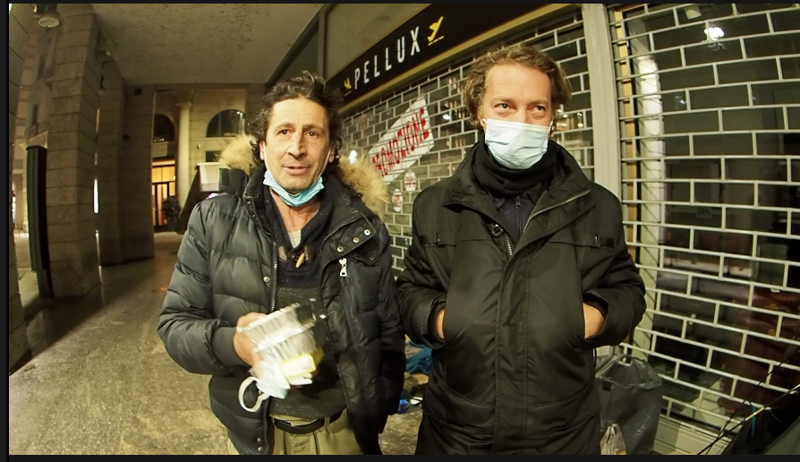Di notte, ai tempi della pandemia, piazza Duomo appare deserta, ma non è così: sotto i portici, fino a san Babila, sono almeno duecento i senza tetto che alloggiano col sacco a pelo in ricoveri di fortuna: compaiono con le loro tende e i loro cartoni verso le 20, quando i negozi chiudono. Ogni lunedi sera è festa, arrivano i volontari della Protetto che distribuiscono pasti caldi. Sono ex operai, un mungitore, un meccanico, un portiere d’albergo, una body guard, un capo chef : ecco i nuovi disoccupati, i neo clochard non per scelta romantica ma per necessità che popolano, invisibili di giorno, le notti milanesi, una movida di disperazione accanto alle vetrine del Quadrilatero della moda.