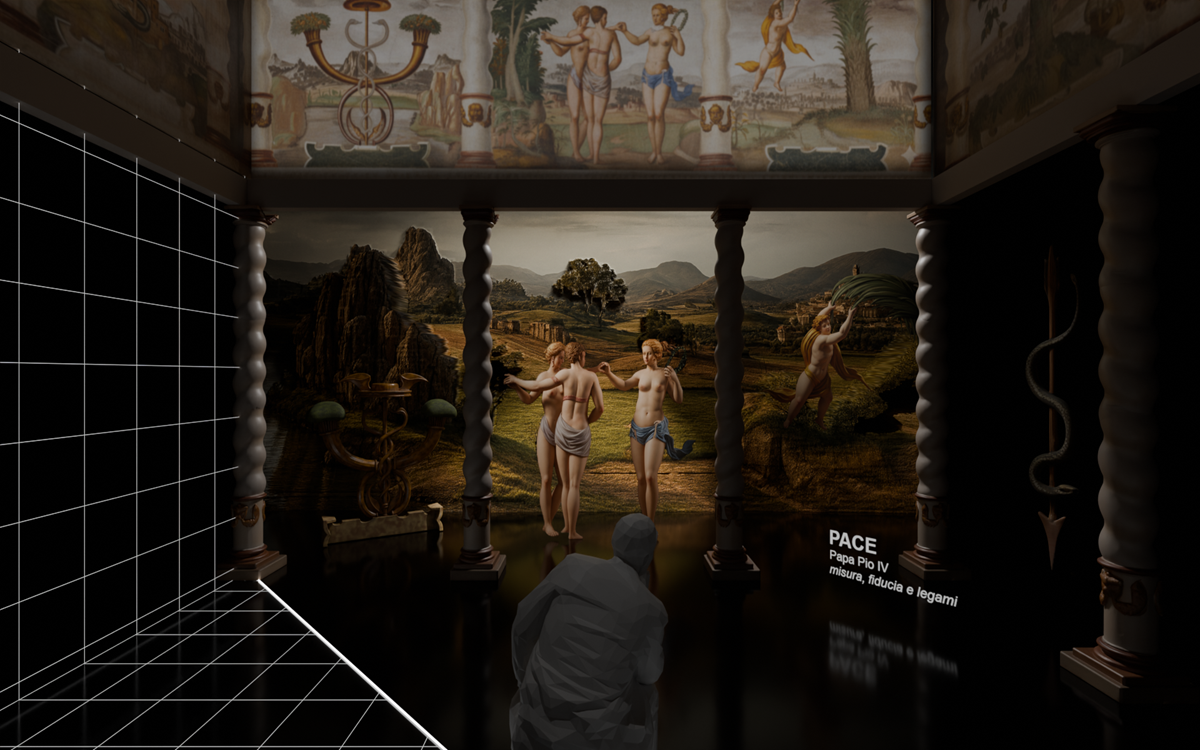 La realtà virtuale trasforma la Sala degli Emblemi in un teatro immersivo a due palchi, dove antico e contemporaneo dialogano. Il visitatore può “entrare” negli affreschi, attraversare gli emblemi e scoprire gli universi simbolici delle stagioni della Guerra e della Pace, riflesso delle due anime del castello: quella architettonica del Medeghino e quella politico–civile di Pio IV.