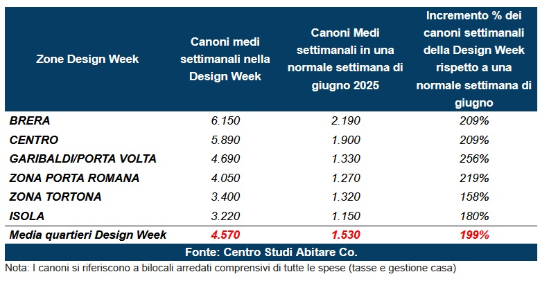 Durante la settimana del design, il canone medio settimanale di un’abitazione a Milano triplica rispetto a una settimana senza eventi internazionali (+199%), passando da 1.530 euro a 4.570 euro. Gli aumenti più significativi si registrano nei quartieri Garibaldi/Porta Volta (+256%) e Porta Romana (+219%). Anche nei sei comuni dell’hinterland analizzati si osserva un forte incremento (+192%), con il canone settimanale che raggiunge in media 1.810€. E' l'analisi del Centro Studi Abitare co.