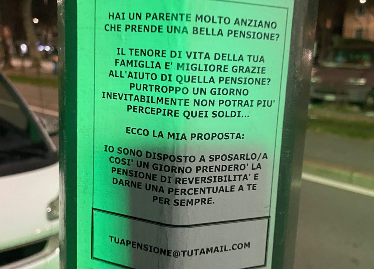 "Hai un parente molto anziano che prende una bella pensione? Il tenore di vita della tua famiglia è migliore grazie all’aiuto di quella pensione? Purtroppo, un giorno inevitabilmente non potrai più percepire quei soldi… ECCO LA MIA PROPOSTA: io sono disposto a sposarlo/a. Così un giorno prenderò la pensione di reversibilità e darne una percentuale a te. Per sempre." A seguire, un contatto email che suona quasi come una beffa: tuapensione@tutamail.com.
