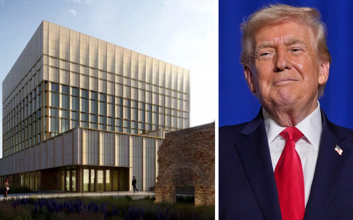 Il rendering del nuovo consolato Usa a Milano e Donald Trump