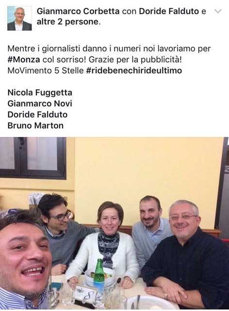 Patrizia Bedori ha fatto scuola. Ci ha messo un po' di meno, la sua omologa monzese, ma alla fine ha fatto la stessa scelta, Doride Falduto. Lei era stata portata alla ribalta nazionale, dopo la graticola e la scelta dei militanti, perché era stata votata da 20 persone. E il Pd aveva attaccato a testa bassa: noi facciamo le primarie, voi scegliete i candidati con 20 persone. Il Movimento 5 Stelle si era chiuso a riccio, a difesa della sua candidata. Tanto che Gianmarco Corbetta, consigliere regionale, postava sul suo profilo Facebook una dura presa di posizione contro i giornalisti scrivendo: "Mentre i giornalisti danno i numeri, noi lavoriamo per Monza con il sorriso! Grazie per la pubblicità! Movimento 5 Stelle" E poi l'hashtag ironico: #ridebenechirideultimo.