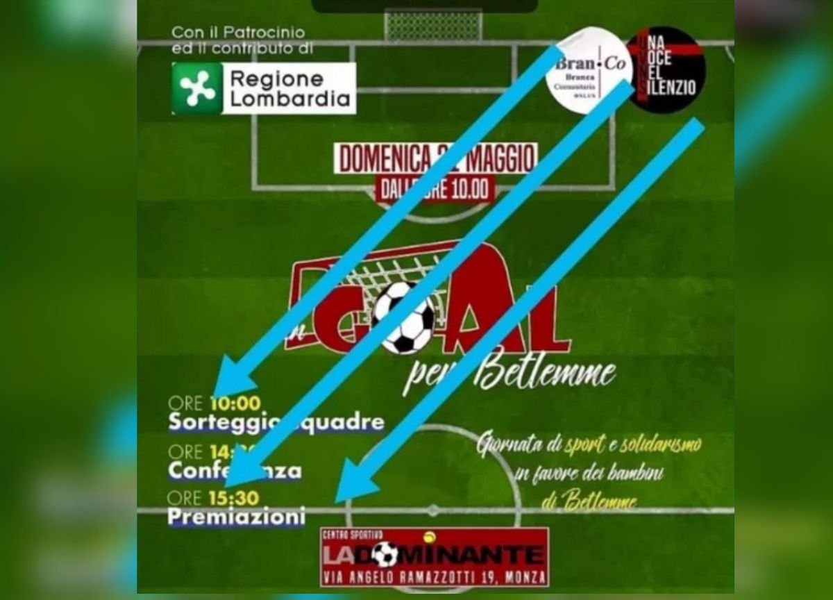 Il 21 maggio a Monza Bran.co organizza #amAbilmente – un goal per #Betlemme torneo di calcio definito “solidarista”, che si terrà nel centro sportivo “La Dominante” Su Facebook la onlus di estrema destra scrive: “Grazie ancora a Regione Lombardia per aver voluto patrocinare questa iniziativa a favore di un’infanzia la cui terra è martoriata. Domenica 21 vedremo dei ragazzi fieri e instancabili che si sfidano sui campi di gioco, tenaci nel rincorrere il pallone e soprattutto entusiasti di tirare in porta, abbattendo le barriere a suon di goal. Sarà una giornata memorabile!”