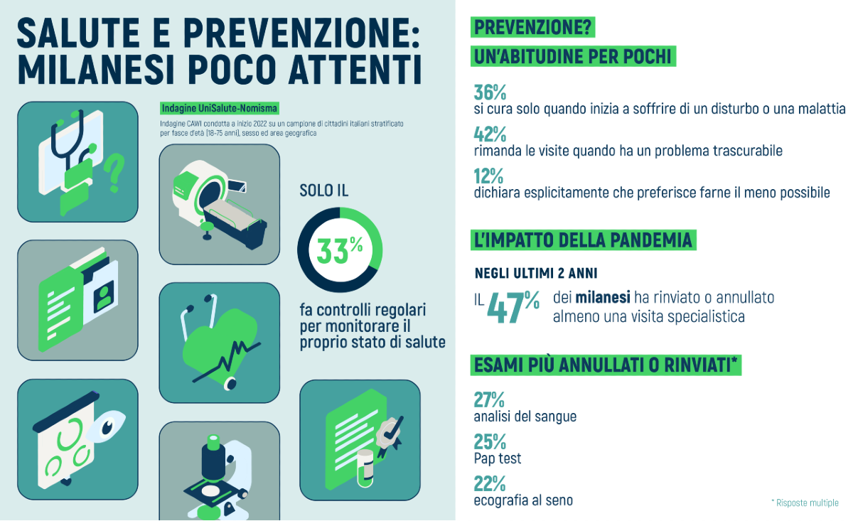 Milanesi e prevenzione, un rapporto complicato: a dirlo è l’ultima ricerca dell’Osservatorio Sanità di UniSalute in collaborazione con Nomisma, che ha indagato la propensione degli abitanti del capoluogo meneghino a tenere sotto controllo il proprio stato di salute. Il quadro che emerge è quello di una diffusa trascuratezza, con la pandemia che ha inferto un colpo significativo alla frequenza di visite ed esami specialistici per la prevenzione.