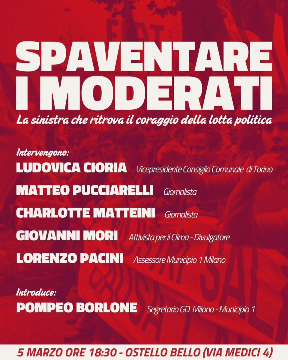 “Spaventare i moderati”. Questo il nome provocatorio di un incontro promosso per il 5 marzo alle 18.30 all’Ostello Bello di Milano che sta già alimentando il dibattito all’interno del centrosinistra meneghino. “La sinistra che ritrova il coraggio della lotta politica” è il payoff dell’evento. Il cui manifesto non ha simboli di partito. E però tra i suoi partecipanti figurano due dem milanesi: il segretario dei Giovani Democratici del Municipio 1 Pompeo Borlone e soprattutto Lorenzo Pacini, dirigente del Pd ed assessore del Municipio 1 già in passato distintosi per alcune posizioni forti in contrapposizione al suo stesso partito.