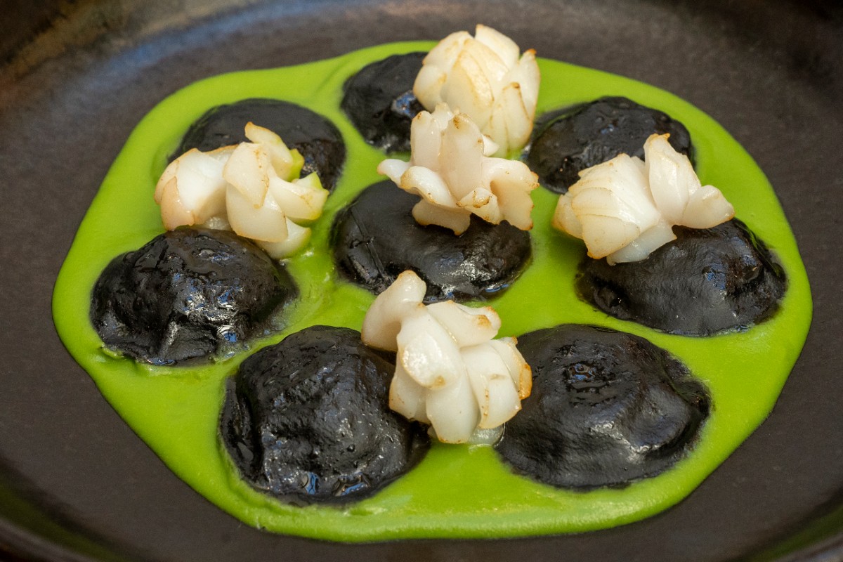 -Bottoni neri, patata al limone , crema di piselli e seppia arrosto. 32€