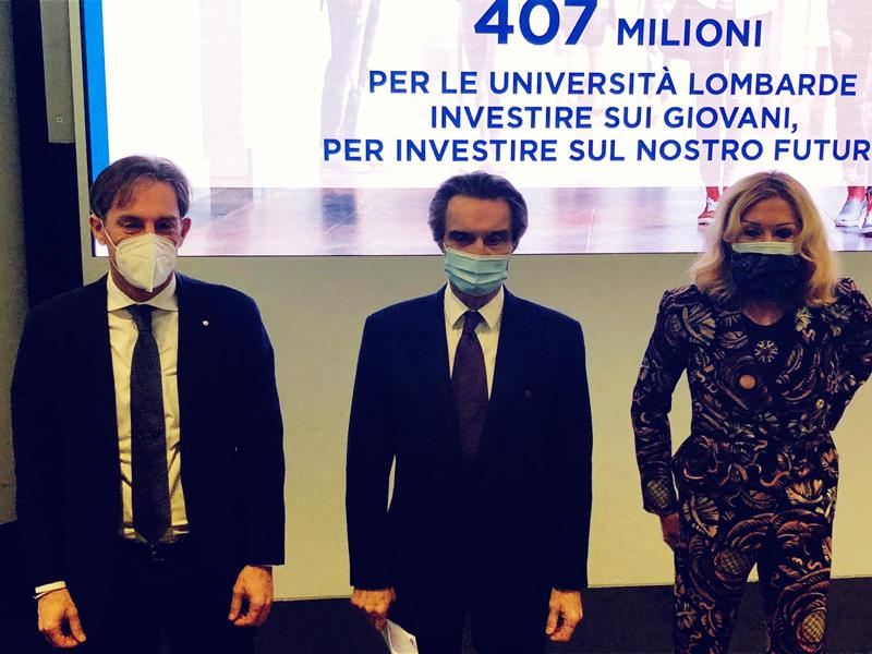 Negli ultimi tre anni Regione Lombardia ha investito 407 milioni con una serie di iniziative importanti anche per il diritto allo studio e le ‘borse di studio’ per aiutare concretamente chi vuole impegnarsi a questo ‘pacchetto’ di fondi e iniziative è stato presentato dal presidente della Regione Lombardia, Attilio Fontana, insieme al vicepresidente e assessore Fabrizio Sala (Università, Ricerca, Innovazione, Export e Internazionalizzazione delle imprese) e all’assessore Melania Rizzoli (Istruzione, Formazione e Lavoro). Alla conferenza stampa sono intervenuti anche Remo Morzenti Pellegrini, rettore dell’Università di Bergamo e Presidente del Crul; Elio Franzini, rettore dell’Università degli Studi di Milano; Giovanna Iannantuoni, rettrice dell’Università degli Studi di Milano Bicocca; Ferruccio Resta, rettore del Politecnico di Milano; Francesco Svelto, rettore dell’Università di Pavia e Maurizio Tira, rettore dell’Università degli Studi di Brescia. “Crediamo molto – ha detto Fontana – nel sistema universitario lombardo, nelle nostre scuole di specializzazione e in quelle di alta formazione perché sono i punti di riferimento per il futuro della nostra regione e dei nostri giovani. Oggi la Lombardia offre un sistema di assoluta eccellenza che ha grandi capacità di attrazione. Basti pensare che oltre il 30% degli studenti universitari in Lombardia proviene da fuori regione e che oltre l’8% sono studenti stranieri”. Questo, dunque, è ciò che spinge la Regione Lombardia ad investire sul sistema universitario. Dall’inizio della legislatura sono stati infatti stanziati 407 milioni di euro per finanziare le Università e la ricerca lombarda. In questo pacchetto rientra anche la realizzazione del nuovo Campus dell’Università degli Studi di Milano nel Distretto dell’Innovazione Mind di Milano per un importo di 130 milioni di euro.