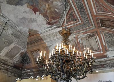 Il soffitto della Sala del Trono, dove si vede il "triangolo" restaurato e il resto ancora decadente e in attesa di un restauro