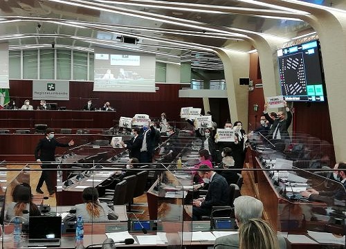 Protesta del M5s nel Consiglio regionale della Lombardia contro il ripristino del vitalizio all'ex governatore Roberto Formigoni. Contro la decisione, presa da una commissione del Senato, i consiglieri lombardi hanno esposto in aula dei cartelli con le scritte: "Basta dane' ai condannati", "Meno ristori piu' vitalizi", "Ai lombardi meno sanita' al Celeste soldi in quantita'". Sulla questione vitalizi il M5s ha anche presentato una mozione urgente al Consiglio regionale, a prima firma Dario Violi, che "impegna" il governatore Attilio Fontana e la Regione Lombardia a "farsi promotori, presso le istituzioni centrali, di una doverosa uniformita' di trattamento, anche per i parlamentari della Repubblica, nell'esclusione dell'erogazione dell'assegno vitalizio".