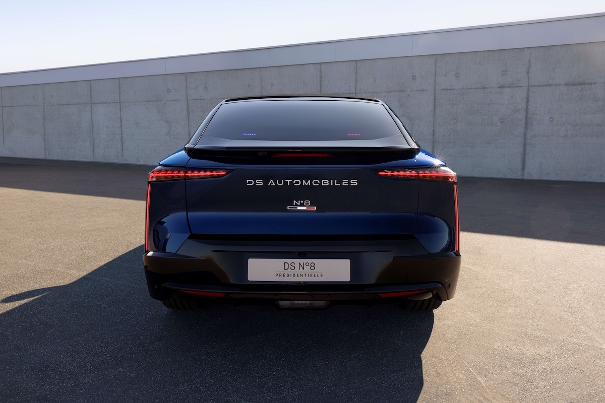 Disegnata per sfilare il più vicino possibile alla folla durante gli eventi ufficiali, la DS N°8 Presidenziale è stata progettata con una livrea esclusiva Blu Zaffiro, tonalità profonda già usata per la DS 7 ÉLYSÉE. A renderla immediatamente riconoscibile sono i dettagli raffinati: i pannelli posteriori in nero lucido, i badge tricolori, la calandra DS LUMINASCREEN illuminata nei colori della bandiera francese e i supporti portabandiere integrati nel paraurti anteriore.
