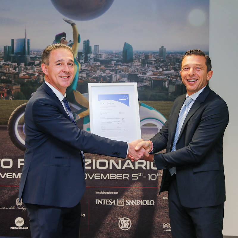 Durante la consegna del certificato il Vice President System Certification TÜV NORD Italia Stefano Porelli ha avuto modo di congratularsi con EICMA per il risultato conseguito, “frutto di un grande impegno e attenzione alla sostenibilità della tecnostruttura organizzativa, come valore fondate ed evidenza del percorso di innovazione e miglioramento continuo di questo appuntamento fieristico”.