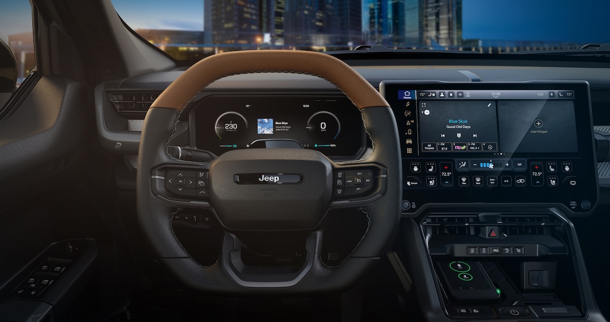 Cuore del sistema è l’infotainment Uconnect 5, nelle sue declinazioni più evolute: grafica pulita, grande luminosità, menù personalizzabili e pulsanti digitali di grandi dimensioni, pensati per essere utilizzati anche quando la vettura sobbalza su una pietraia. Le nuove pagine dedicate BEV mostrano in tempo reale lo stato di carica, i flussi di energia e le impostazioni di ricarica, mentre la funzione Dynamic Range Mapping sviluppata con TomTom aiuta a pianificare i viaggi indicando dove e quando sarà meglio fermarsi per ricaricare.