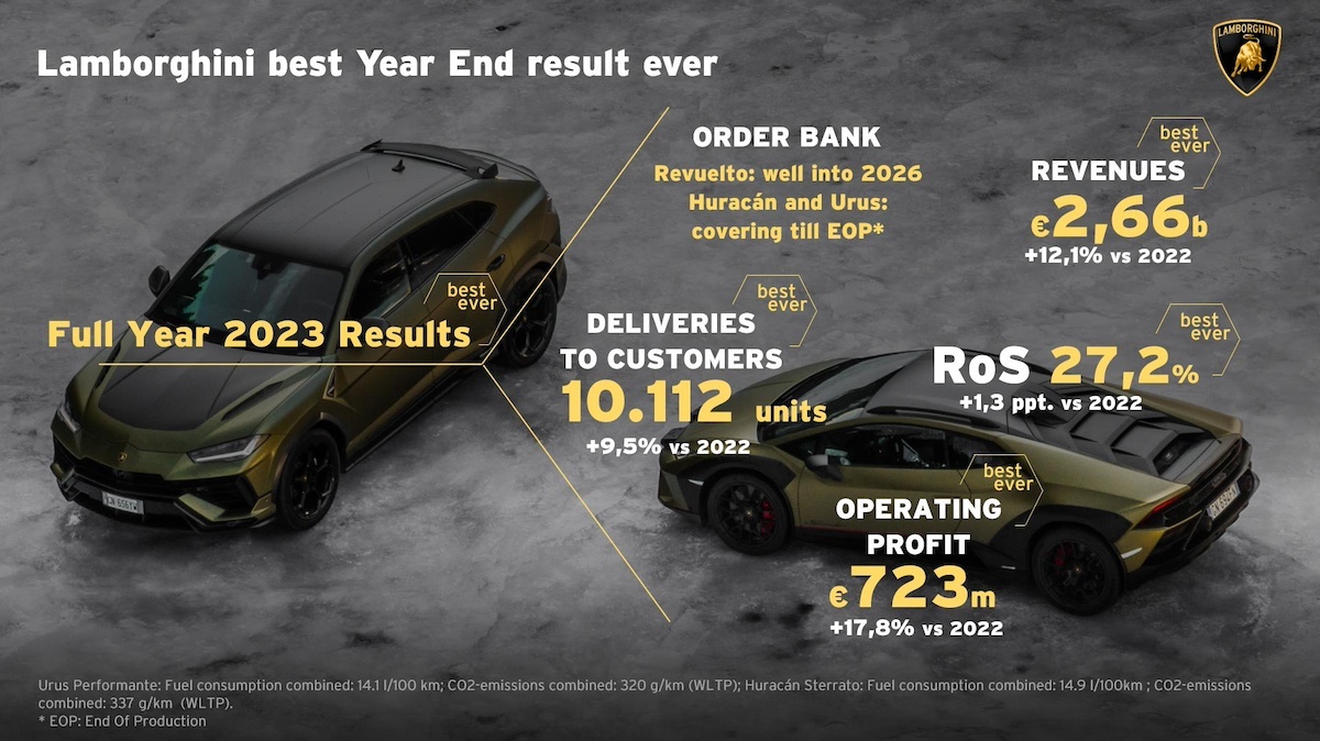 Gli straordinari risultati del 2023 sono particolarmente significativi in considerazione del successo della Revuelto, che già conta un portafoglio ordini superiore ai due anni, e della transizione verso powertrain ibridi per i modelli Huracán e Urus nel 2024. La determinazione di Lamborghini nel perseguire una strategia di crescita sostenibile si riflette nella sua Direzione Cor Tauri, che mira a una maggiore profittabilità attraverso pratiche ambientalmente e finanziariamente sostenibili.
