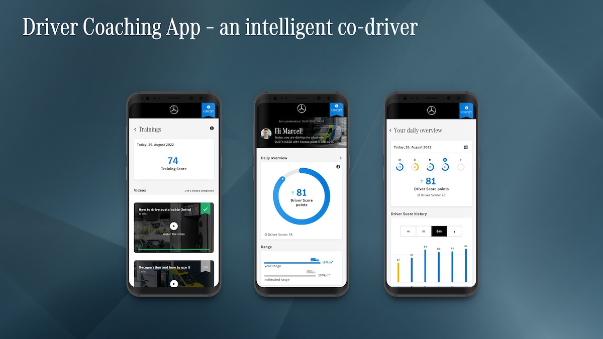 L'app Driver Coaching sviluppata da Mercedes-Benz insieme a WITTE:digital - parte di WITTE Automotive GmbH - registra e valuta tutti questi fattori per garantire la comparabilità del comportamento di guida e dell'obiettività all'interno di una flotta. Nelle operazioni quotidiane, questa soluzione su misura per le flotte di veicoli funge da "copilota intelligente" e mira a fornire ai conducenti un'assistenza specifica per ottimizzare il loro comportamento di guida. L'obiettivo: un significativo miglioramento del raggio d'azione e la conservazione delle risorse. Oltre al feedback specifico sul comportamento di guida individuale, il programma include approcci di formazione che motivano una guida più efficiente. Inoltre, gli utenti hanno la possibilità di personalizzare l'app e adattarla alle proprie esigenze con l'aiuto di vari moduli, ad esempio per la pianificazione del carico e del percorso, l'integrazione ERP e la gestione dei documenti di trasporto. La visione del prodotto di questa futura app sarà presentata in SUSTAINEER. La soluzione è attualmente in fase di sviluppo e non è ancora un prodotto commercializzabile. Nel corso di un ulteriore sviluppo, è quindi possibile apportare modifiche al prodotto mostrato. L'app non deve essere utilizzata durante la guida.