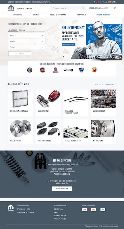 Cardine di quest’esperienza è infatti una proposta diversificata di servizi su misura per ogni vettura FCA; ogni cliente può comodamente configurare ed acquistare tagliandi, pacchetti di manutenzione, servizi personalizzati e altro ancora, prenotando contestualmente l’appuntamento presso la concessionaria più comoda nel giorno e orario desiderati. Ma non solo: sul Mopar e-Store sono in vendita da subito oltre 6.000 Ricambi Originali Mopar, gli unici a potersi fregiare della qualità certificata FCA, insieme a una selezione di circa 2.000 Authentic Accessories, capaci sempre di esaltare il design e le funzionalità di ogni singolo veicolo del gruppo FCA.