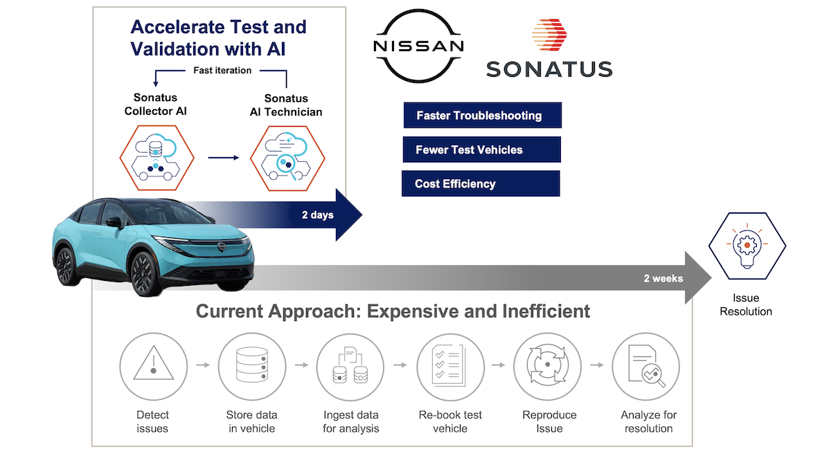 Nissan rivoluziona i test auto con l'IA di Sonatus: i tempi di diagnosi crollano da settimane a giorni. Ecco come nasceranno le nuove LEAF e JUKE.
