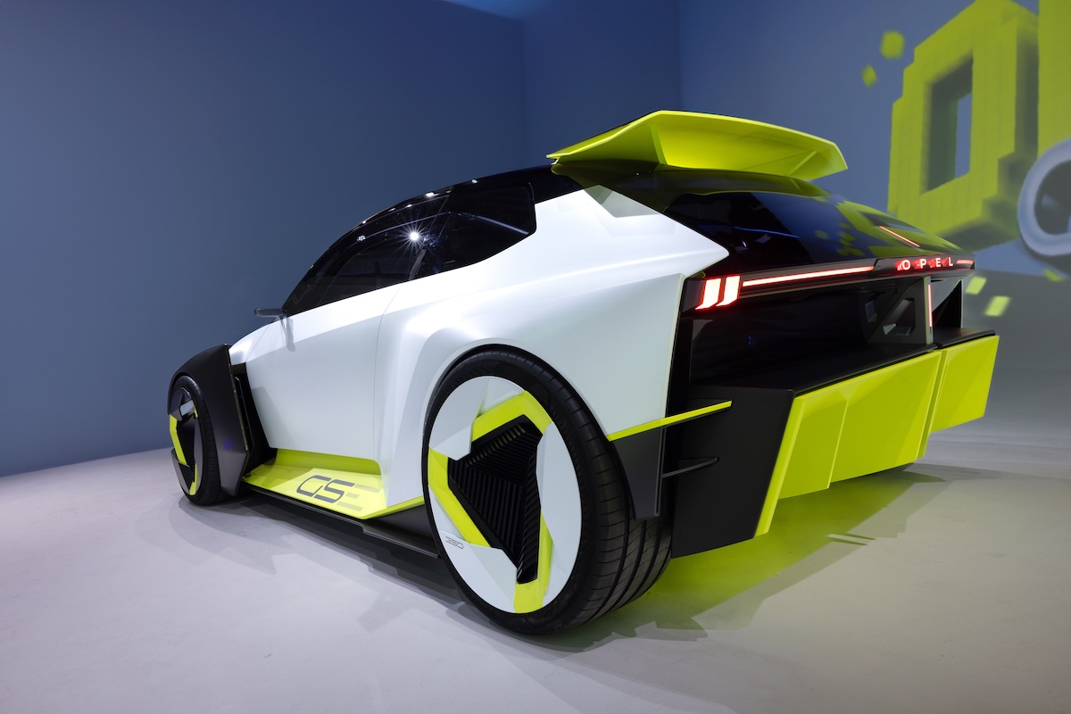 La forma segue la funzione, e non lo fa in silenzio. Le tendine aerodinamiche davanti ai parafanghi riducono turbolenze e aiutano la maneggevolezza alle alte velocità; i parafanghi neri a profilo aerodinamico e le ruote aero limitano i vortici nei passaruota. Il diffusore attivo e lo spoiler attivo modulano la deportanza secondo la situazione, cercando l’equilibrio tra stabilità e velocità di punta. A firmare la taratura dinamica concorrono gli ammortizzatori Bilstein, mentre i cerchi sfoggiano un gioco cromatico che enfatizza l’impronta a terra: 21” neri e gialli all’anteriore, 22” bianchi e gialli al posteriore, con pneumatici Goodyear. Nei dettagli compaiono i triangoli tronchi ispirati all’epica Opel Manta 400, dal roll-bar allo spoiler: piccole citazioni che legano la concept ai rally di casa.