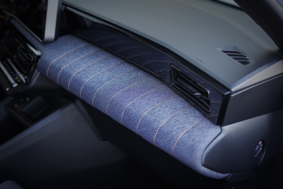 Cambiando versione, cambia completamente l'atmosfera. L'allestimento Techno è un tuffo nel carattere informale e grintoso del denim. L'ispirazione arriva direttamente dal mondo dei jeans, unendo un tessuto "textile refined" blu scuro a un poliestere riciclato dalla tonalità blu saturo. I designer si sono divertiti a nascondere piccoli dettagli che fanno la differenza, come i rivetti in rame sui sedili che celano l'easter egg "Allez-y vous êtes en Renault 4", mentre le cuciture ramate evocano l'universo del denim. La stessa cura si ritrova sulla plancia e sui pannelli porta, che presentano lo stesso raffinato tessuto trapuntato.