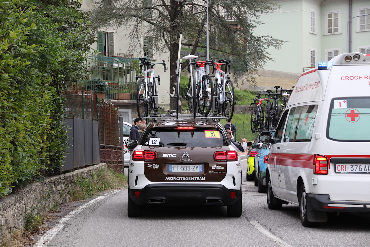 La cronaca della competizione diventa poco rilevante rispetto all’adrenalina che corre a fiumi nel nostro Citroën SpaceStar. Incrociamo la corsa in punti differenti e cogliamo l’ammiraglia in azione, proprio mentre lungo la parte finale della salita del Ghisallo riceve da un concorrente la copertura indossata dalla partenza: il tempo sta per migliorare e non occorre più. Tra le valli bergamasche ecco che l’altra ammiraglia informa l’ambulanza che il concorrente soccorso sta meglio: un gesto rapido e inequivocabile.