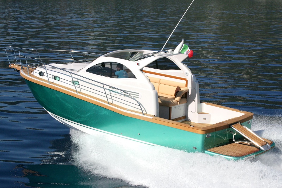 Tra i protagonisti del percorso c’è anche il Portofino 10 Spider, cruiser open di dieci metri che interpreta il mare in chiave contemporanea. La livrea color acquamarina richiama le sfumature della costa ligure, mentre gli spazi esterni sono pensati per vivere il ponte come un salotto a cielo aperto: prendisole generosi, divani comodi, passaggi fluidi tra zona pranzo e area relax. Sottocoperta, una cabina accogliente e un bagno completo confermano la vocazione da weekender di lusso.