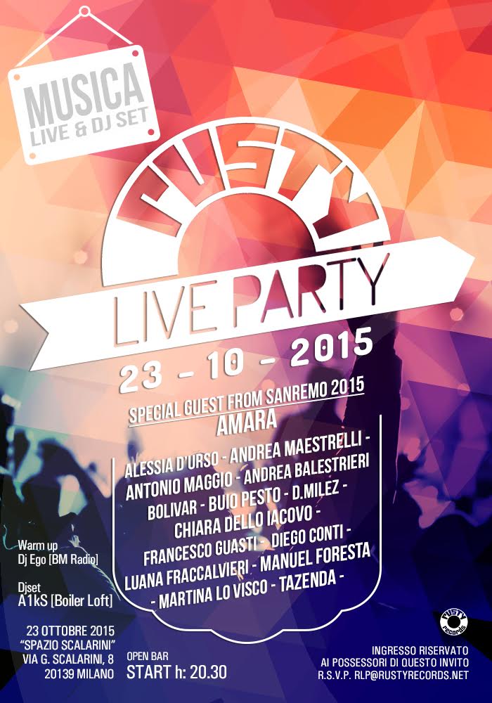 Il 23 ottobre presso la sala eventi della Rusty Records, tutti gli artisti dell’etichetta si esibiranno sul palco del “Rusty Live Party” per festeggiare il 7° compleanno della giovane etichetta, vincitrice della 63° edizione del Festival di Sanremo nella sezione giovani con il cantautore Antonio Maggio, un’occasione unica per dare spazio alla nuova musica e per festeggiare insieme ad amici, fans, e addetti ai lavori.