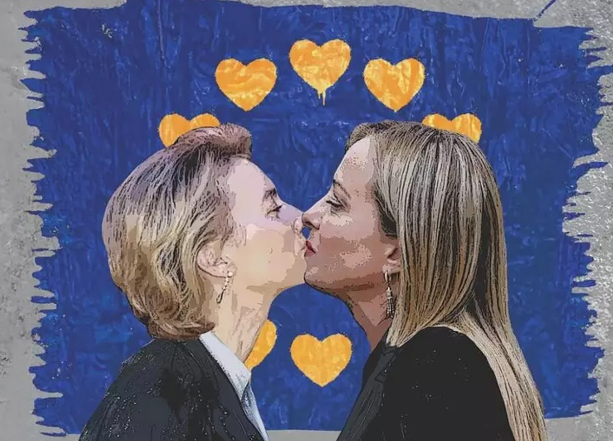 Meloni-Ursula, il bacio virale dipinto da TvBoy