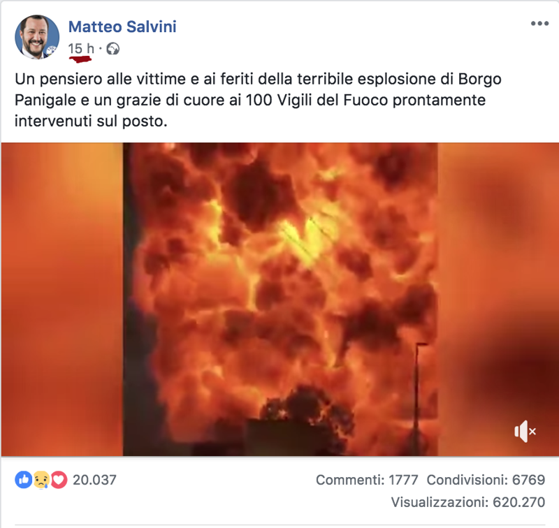 Peccato però che il post di Salvini alla fiera risalga ad almeno sei ore addietro, pubblicato quindi molto prima dell'incidente, e che - già tre ore prima del post indignato della Morani - il leader del Carroccio ne abbia inserito sul suo profilo ufficiale un altro nel quale manifesta il proprio cordoglio alle vittime e ai feriti nel disastro automobilistico di Borgo Panigale, ringraziando anche i vigili del fuoco presenti sul luogo dell'incidente. Un post tempestivo che probabilmente l'onorevole Morani non ha visto sulla pagina di Salvini, ma che - come dimostrano gli orari di pubblicazione dei vari post pubblicati nella nostra gallery - era ben presente on line da ore.
