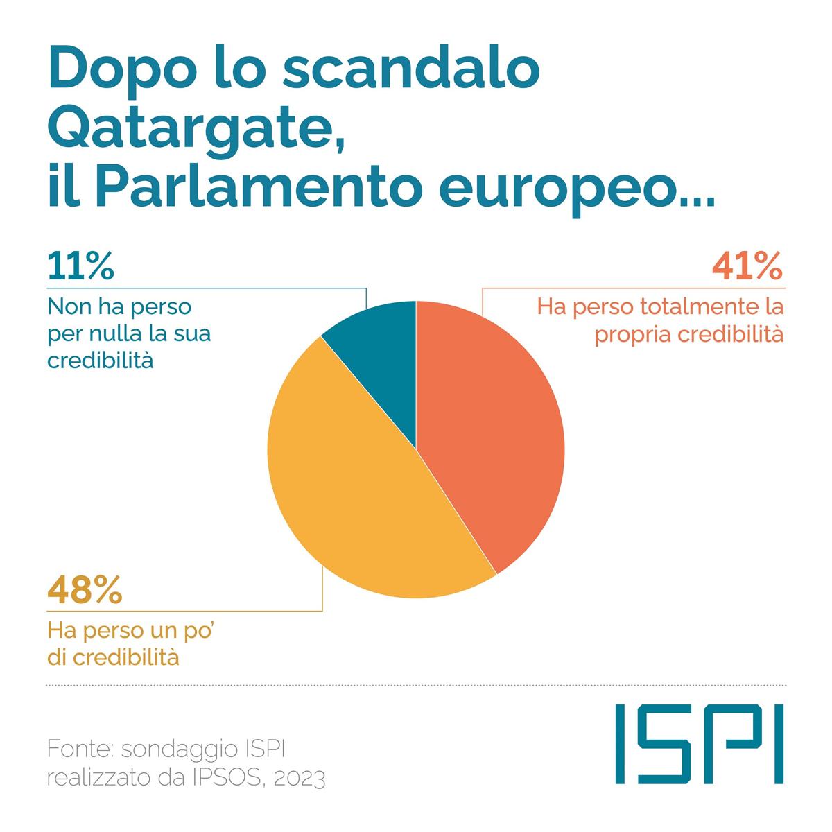 Dopo lo scandalo Qatargate, la fiducia degli italiani nel Parlamento europeo sembra essere molto diminuita. Solo per l’11% di loro il Parlamento europeo non avrebbe perso credibilità in seguito allo scandalo, mentre per 4 italiani su 10 il PE avrebbe perso “totalmente” la propria credibilità (41%).