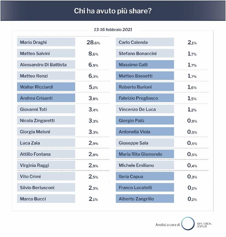 Dai dati emerge che questi ultimi hanno preso una fetta consistente nel dibattito degli ultimi giorni. Se dal 13 febbraio, giorno del giuramento dei ministri, il Neopresidente del Consiglio Mario Draghi occupa il 28,6% dei contenuti analizzati, seguito da Matteo Salvini (8,6%), Alessandro Di Battista (6.9%) e Matteo Renzi (6,3%), al quinto e sesto posto troviamo Walter Ricciardi (5,1%) e Andrea Crisanti (3,8%), protagonisti in queste ore di un acceso dibattito circa le loro dichiarazioni sulla necessità di un nuovo lockdown. I due esperti superano per share online protagonisti della politica come il Presidente della Liguria Giovanni Toti (3,4%), il segretario del PD Nicola Zingaretti (3,3%), la leader di Fratelli d’Italia Giorgia Meloni (3,3%), il Presidente del Veneto Luca Zaia (2,9%) e quello della Lombardia Attilio Fontana (2,8%).