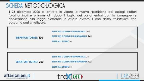 Alla Camera Lega, Fratelli d’Italia, Forza Italia e altri di Centrodestra avrebbero 218 seggi su 400. Alla coalizione Pd-M5S-altri solo 154. Al Senato Centrodestra a quota 113 seggi contro 74 dell’attuale maggioranza che sostiene il governo Conte.