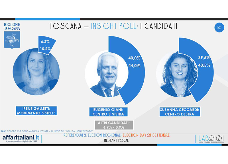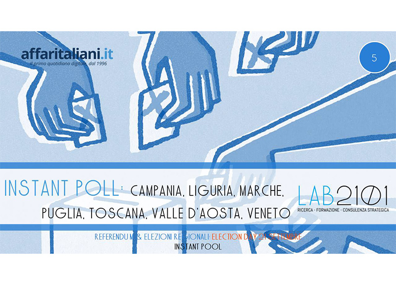 Vittoria a valanga di Luca Zaia in Veneto, ampio successo di Giovanni Toti in Liguria e di Vincenzo De Luca in Campania. Conquista delle Marche da parte del Centrodestra con Francesco Acquaroli. Perfetta parità tra Raffaele Fitto e il Governatore uscente Michele Emiliano in Puglia. Leggerissimo vantaggio di Eugenio Giani (Pd-Italia Viva) su Susanna Ceccardi (Centrodestra) in Toscana. Lega nettamente primo partito in Valle d'Aosta, seguita dal Centrosinistra. In terza posizione la lista di Centrodestra Forza Italia-Fratelli d'Italia, poi l'Union Valdotaine e il Movimento 5 Stelle.