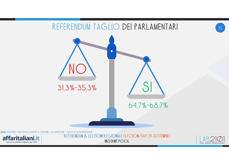 Per quanto riguarda il referendum costituzionale sul taglio dei parlamentari, vittoria netta del Sì alla riduzione del numero degli eletti con una percentuale tra il 64,7 e il 68,7% contro il 31,3-35,3% di chi si è espresso per il No.