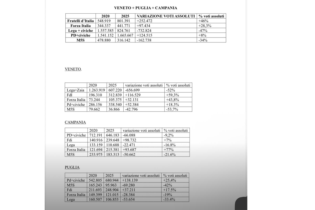 Anche il M5S ha subito un calo di votanti rispetto alle Regionali 2020, anche se non così marcato come quello della Lega. A crescere tantissimo, sempre rispetto a cinque anni fa e non nei confronti delle Politiche 2022 o delle Europee 2024, è stata Fratelli d'Italia (complessivamente nelle tre regioni più 252mila votanti). Forza Italia ha visto un incremento di quasi 100mila elettori e il Partito Democratico insieme a liste civiche che ha registrato un considerevole aumento di quasi 125mila elettori.
