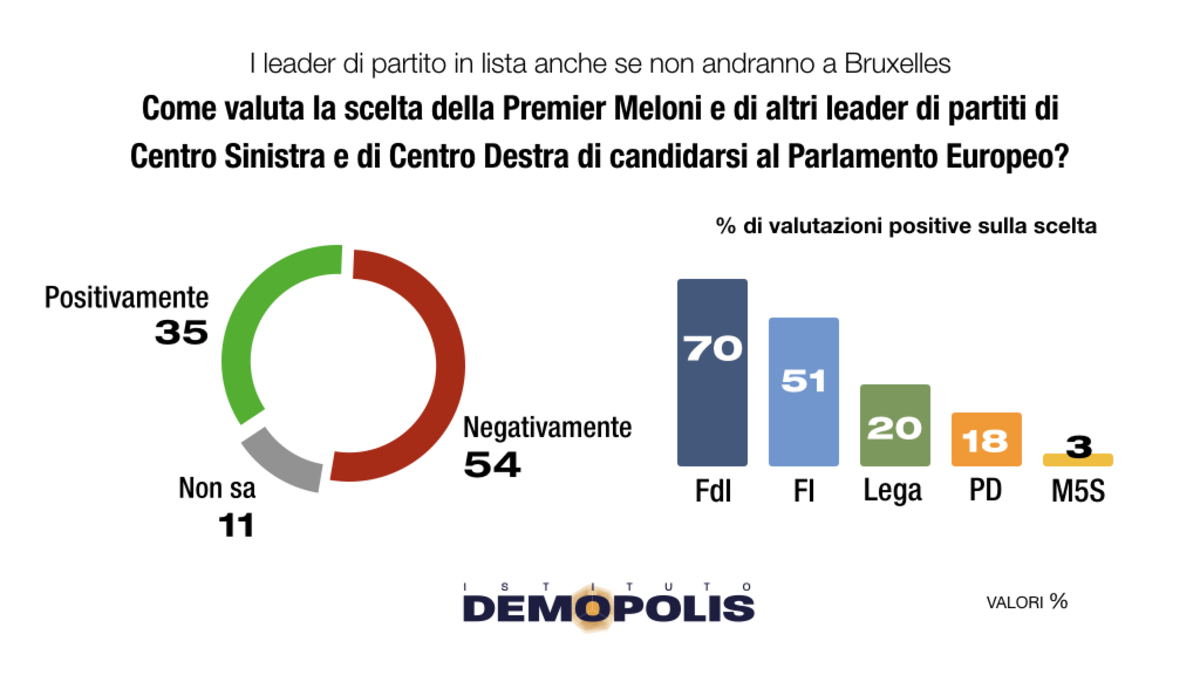 Ma come valutano i cittadini la scelta della Premier Meloni e di altri leader di partiti di Centro Destra e di Centro Sinistra di candidarsi da capilista pur dichiarando che, se eletti, non andranno a Bruxelles? Il giudizio della maggioranza assoluta degli italiani è critico, ma – rileva Demopolis - è una questione di principio che sembra pesare soprattutto nell’area di Centro Sinistra: il 70% di chi vota FdI accetta l’idea di votare Giorgia Meloni per rafforzarla politicamente, pur sapendo che resterà a Roma. Le valutazioni positive si riducono al 18% tra gli elettori del PD e al 3% tra chi vota il M5S.
