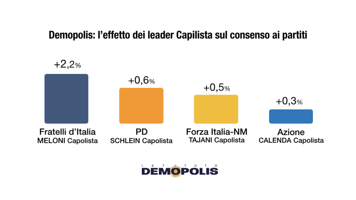 La presenza dei leader in lista – secondo l’analisi dell’Istituto diretto da Pietro Vento - ha comunque un’incidenza sul consenso: con Giorgia Meloni, Fratelli d’Italia guadagna oltre 2 punti percentuali. Di minor impatto le candidature di Elly Schlein e Antonio Tajani che farebbero guadagnare circa mezzo punto al PD e a Forza Italia.