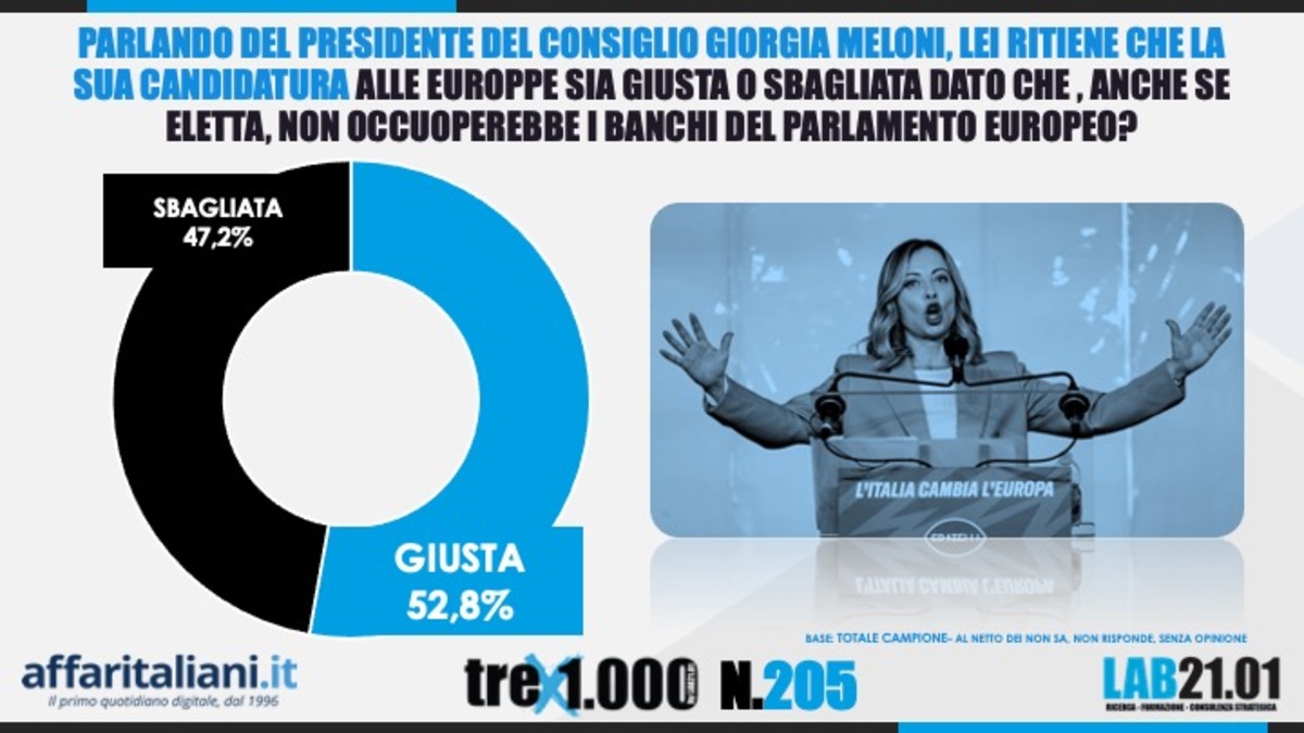 “Penso che gli italiani apprezzino sempre la possibilità di esprimersi, e che sia giusto così. È democrazia”. Con queste parole il presidente del Consiglio Giorgia Meloni, interpellata da Affaritaliani.it, commenta il sondaggio realizzato da Roberto Baldassari, direttore generale di Lab21.01, per Affaritaliani.it secondo il quale la maggioranza assoluta degli italiani (52,8%), non solo di chi vota Fratelli d’Italia o Centrodestra ma quindi anche gli elettori delle opposizioni, ritiene giusta la candidatura della stessa Meloni come capolista per Fratelli d’Italia in tutta Italia alle elezioni europee dell’8-9 giugno anche se, una volta eletta, non andrà a occupare i banchi del Parlamento europeo.