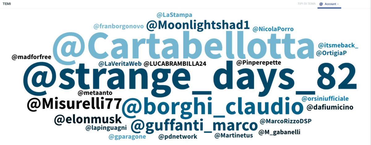 Che questa campagna contro Musk non stia ottenendo l’effetto desiderato lo dimostra poi un altro dato, legato al cosiddetto “sentiment”. “Se dovessimo censire l’audience che si è generata sull’argomento . continua Giordano – allora è sintomatico evidenziare che in rete ha prodotto una polarizzazione molto più profonda e ampia le discussioni avviate da coloro che invece contestavano o polemizzano con questa scelta (comesi può vedere dalla nuvola degli account che hanno ottenuto le interazioni più ampie a partire dalla keyword “abbandonare X)