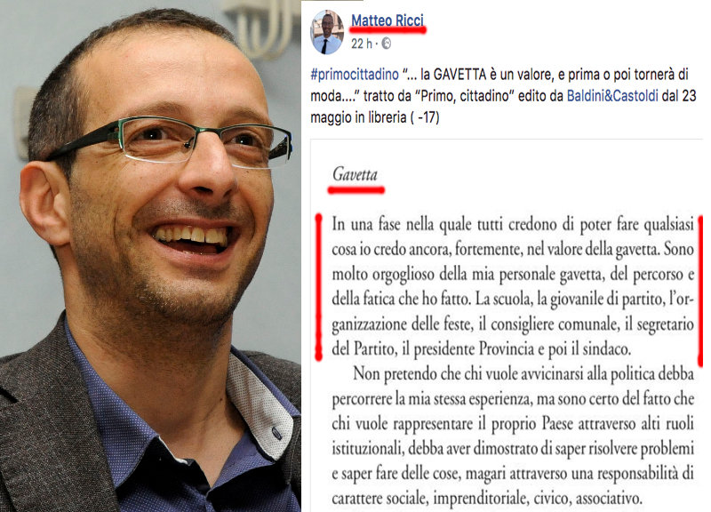 “Primo, cittadino” è edito da Baldini&Castoldi e il 23 maggio vedrà la luce sugli scaffali. Ma il lancio per i fan che apprezzano il politico e leader dem lo ha fatto lui stesso dalle pagine facebook, poche ore fa con un conto alla rovescia e citando un passo significativo del libello dove parla di cos’è la “gavetta”. Una critica neanche tanto velata ai parvenu della politica. Il lettore ingenuo, come chi scrive, pensava ad una sequenza di esempi di vita vissuta, nel mercato del lavoro, casomai realizzando obiettivi d’impresa, partendo dal basso oppure nel campo creativo: quelle classiche storie all’americana dell’uomo che si è fatto da solo, senza mezzi, appoggi ed amicizie. Ricci cita pagina 219 del suo libro: “Gavetta. In una fase nella quale tutti credono di poter fare qualsiasi cosa io credo ancora, fortemente, nel valore della gavetta. Sono molto orgoglioso della mia personale gavetta, del percorso e della fatica che ho fatto. La scuola, la giovanile di partito, l’organizzazione delle feste, il consigliere comunale, il segretario del Partito, il presidente Provincia (scritto cosi, ndr) e poi il sindaco.”