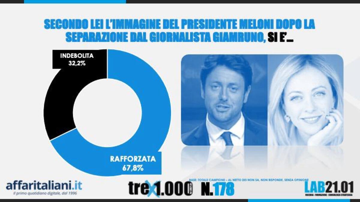 Più di due italiani su tre, pari al 67,8% degli intervistati, ritiene che il caso Giambruno, con i fuori-onda imbarazzanti su Striscia la Notizia e la separazione annunciata sui social da Giorgia Meloni, abbia rafforzato l'immagine della presidente del Consiglio. A pensare che la premier esca indebolita dalla vicenda personale è solo il 32,2% degli italiani. E' quanto emerge dal sondaggio realizzato per Affaritaliani.it da Roberto Baldassari, direttore generale di Lab21.01.