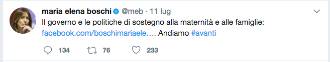 La leader di FdI ce l'ha particolarmente con un tweet di Maria Elena Boschi: "Domani al via domande #bonus nido del #MilleGiorni: 1000euro per famiglie con figli fino a 3 anni. Adesso #avanti con politiche per maternità".