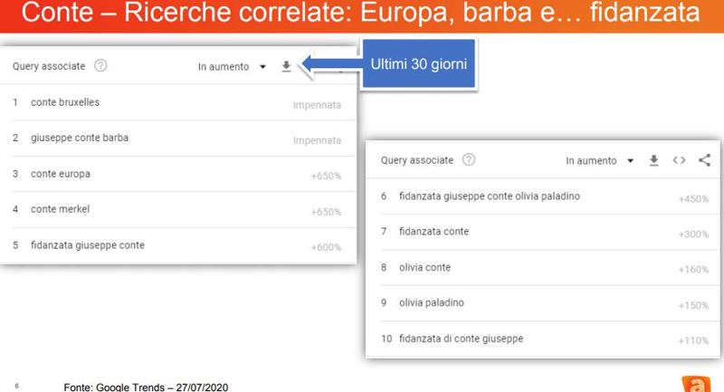 Il Presidente del Consiglio è in assoluto il re delle news di fine luglio. Suscita interesse anche per la vita privata: nel giorno della sua apparizione pubblica con la compagna Olivia Paladino, si è registrato un forte picco su Google. Tra le ricerche correlate infatti, spicca ”fidanzata Giuseppe Conte” con un +600%. Ma una forte impennata sul Premier si è avuta anche con la parola “Giuseppe Conte barba”, seconda solo a “Conte Bruxelles”.