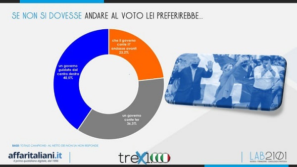 Nel caso in cui non si dovesse andare al voto anticipato, il 40,5% degli intervistati ritiene che la soluzione ideale sarebbe un governo guidato dal Centrodestra. Il 36,3% degli italiani preferirebbe invece un Conte ter mentre soltanto il 23,2% pensa che l'attuale esecutivo Conte II debba andare avanti.