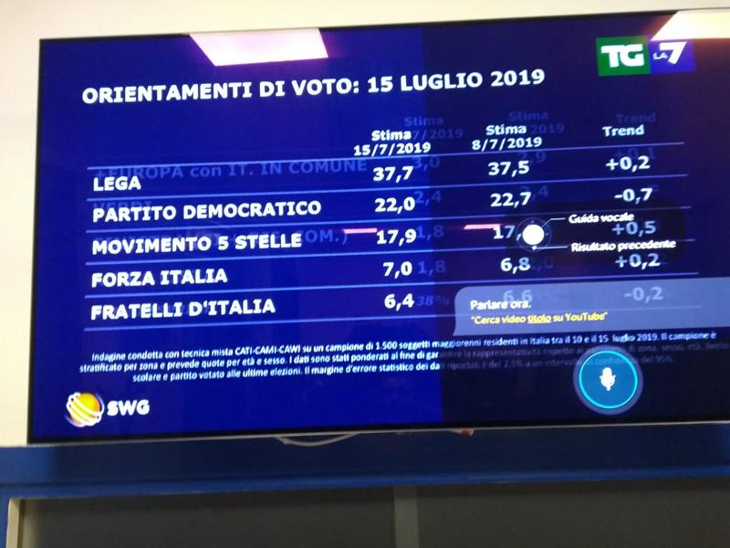 L’effetto Russia non penalizza la Lega di Matteo Salvini. Secondo l’ultimo sondaggio Swg per il Tg di la7 di Enrico Mentana, nell’ultima settimana il Carroccio è salito dello 0,2% raggiungendo il 37,7%. Il Pd in prima fila nell’accusare il ministro degli Interni su Moscopoli, perde 0,7% e scende al 22%. M5s in crescita di mezzo punto al 17,9%. Forza Italia al 7% (+0,2) e FdI al 6,4% (-0,2).