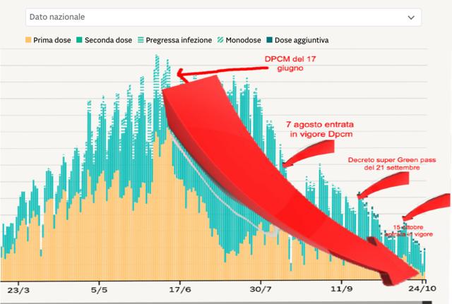 La vaccinazione è ancora più bassa il 21 settembre data del Decreto legge n°127, "Misure urgenti per assicurare lo svolgimento in sicurezza del lavoro pubblico e privato mediante l’estensione dell’ambito applicativo della certificazione verde COVID-19 e il rafforzamento del sistema di screening", che associa il Green Pass al lavoro: senza il certificato verde ampie fasce di italiani non possono lavorare. E’ il cosiddetto super Green Pass. Il crollo è palese il 15 ottobre, data di entrata in vigore del provvedimento che viene anticipato e seguito dallo scatenamento, in tantissime città, di proteste sempre più vivaci.
